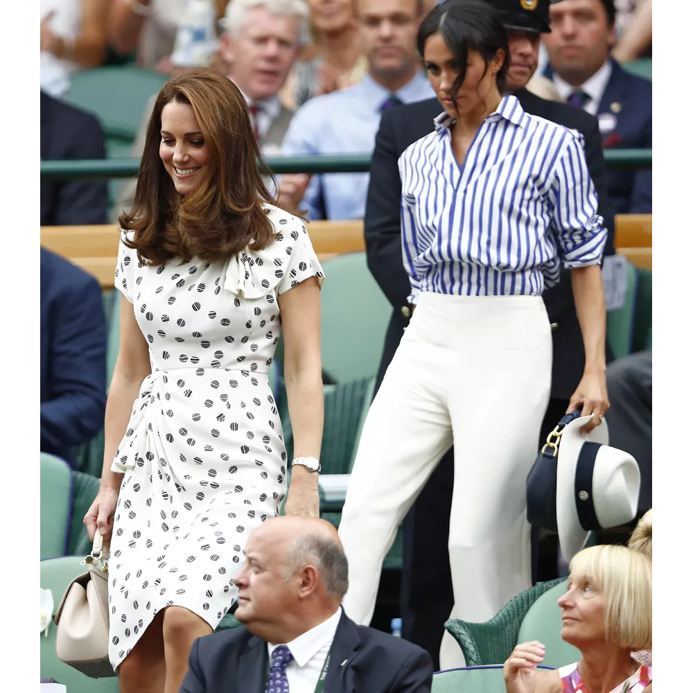 Η Kate Middleton και η Meghan Markle φωτογραφίζονται μαζί στο Royal box του Wimbledon στο παιχνίδι του Rafael Nadal και του Novak Djokovic το 2018.