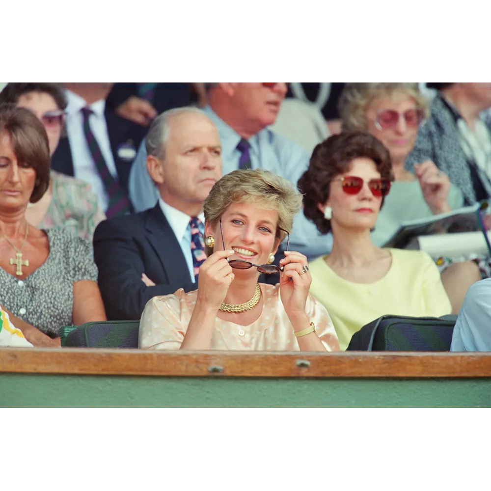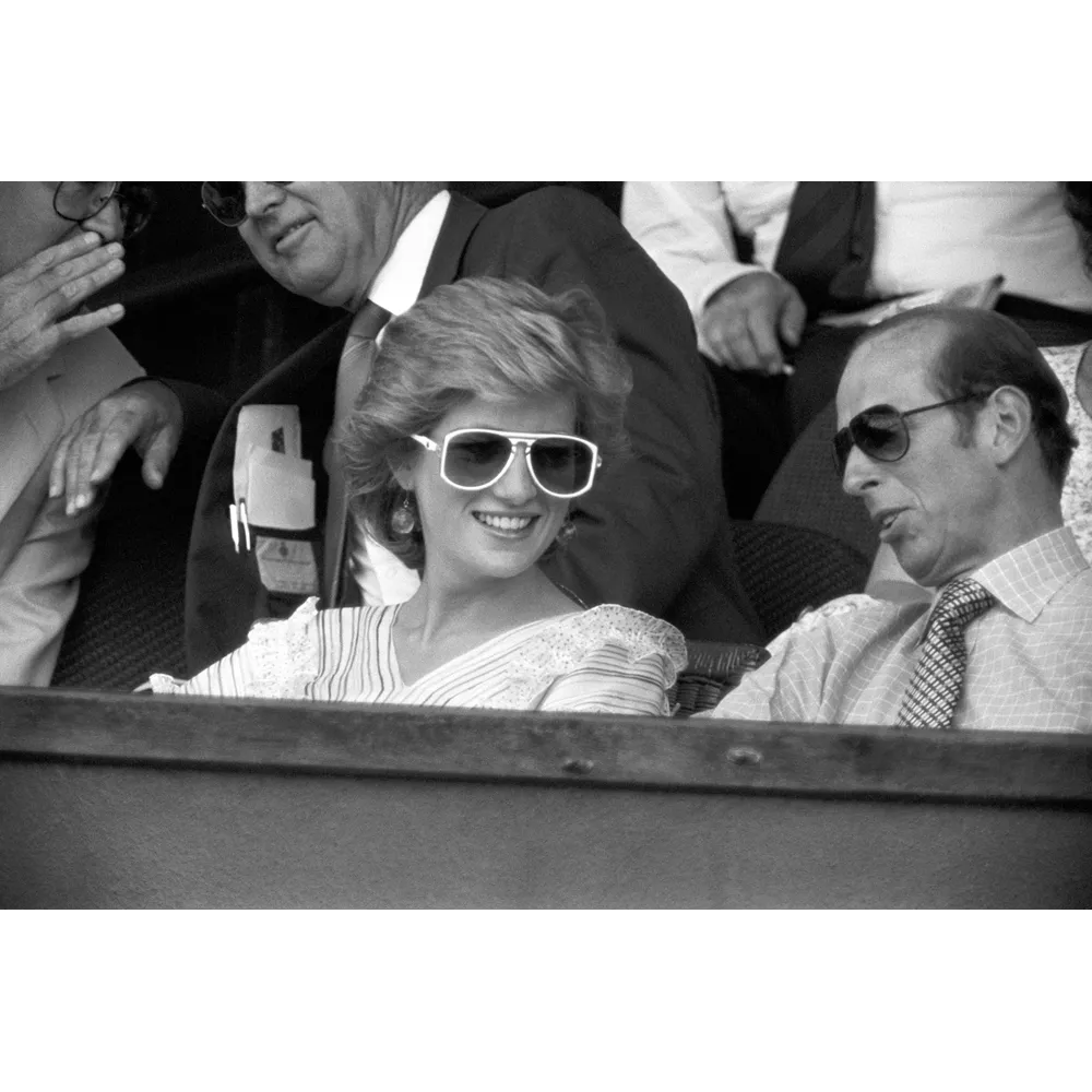 Η Diana με λευκά γυαλιά ηλίου και εντυπωσιακά σκουλαρίκια παρακολουθεί τον αγώνα στο Wimbledon μαζί με τον δούκα του Kent.