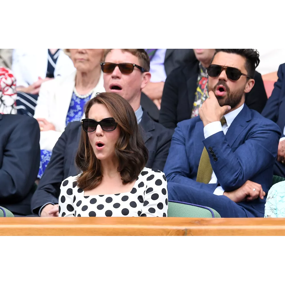 Η Kate Middleton αλλά και ο ηθοποιός Dominic Cooper που κάθεται πίσω της εκπλήσσονται κατά τη διάρκεια του παιχνιδιού την πρώτη μέρα του Wimbledon το 2017.