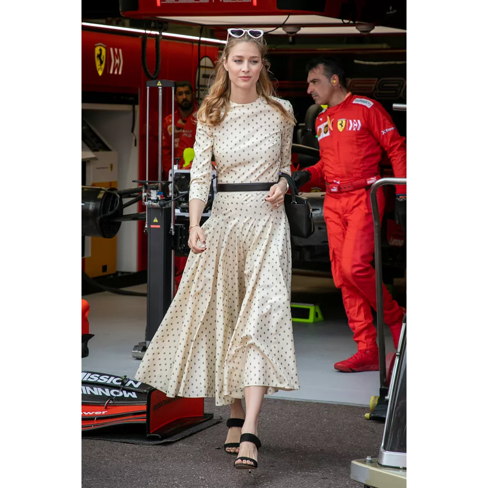 Στο Grand Prix του Μονακό το 2019 με πουά φόρεμα Dior, γυαλιά ηλίου Saint Laurent, τσάντα Armani και μαύρα πέδιλα.
