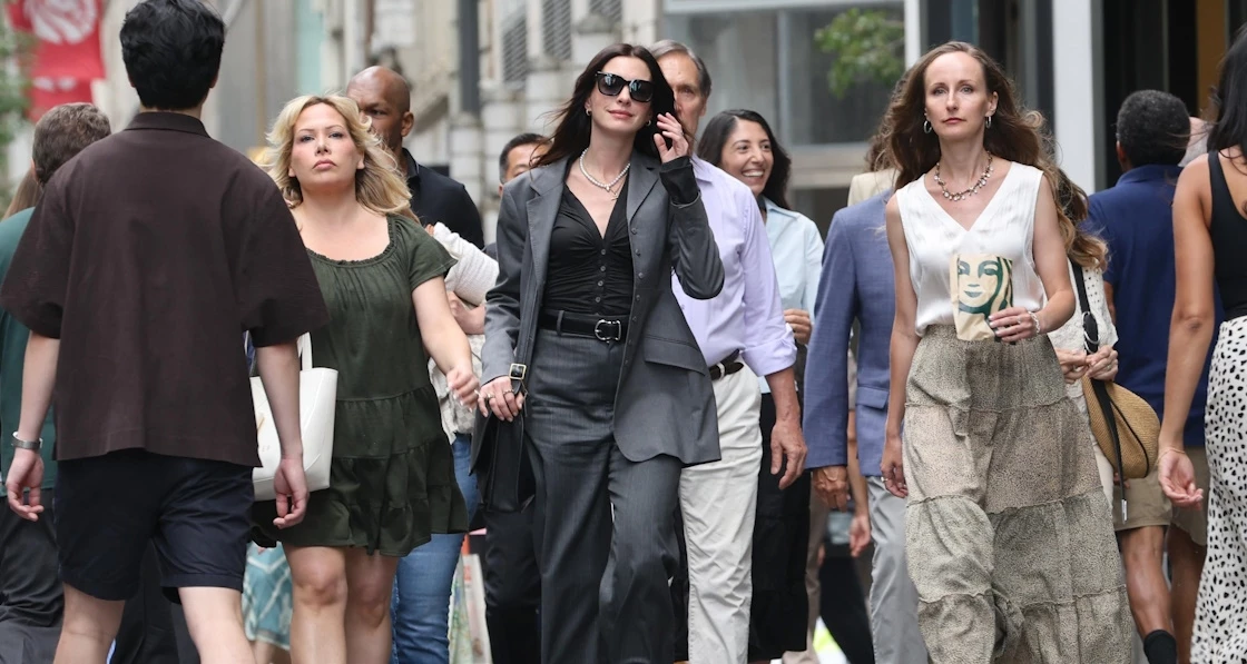 Η Hathaway εντοπίστηκε με 4 εμφανίσεις κατά τη διάρκεια μιας μόνο μέρας γυρισμάτων. Το πρώτο είναι ένα λευκό πουκάμισο και πλισέ φούστα από τη Sacai, την οποία συνδύασε με γόβες της Gabriela Hearst, γυαλιά ηλίου Oliver Goldsmith και T-bar κολιέ. Το απλό κομμάτι κοσμήματος είναι μια ξεχωριστή δημιουργία της Jemma Wynne και έρχεται με μια υψηλή τιμή περίπου 22.000 ευρώ, χάρη στο σχέδιο του από λευκά μαργαριτάρια, χρυσό 18 καρατίων και διαμάντια.