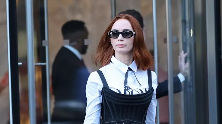 Στα γυρίσματα που πραγματοποιήθηκαν στις 14 Αυγούστου, η Blunt έλαμψε με μια εντυπωσιακή νέα εμφάνιση: ένα παγωμένο ξανθό καρέ με σκούρες ρίζες. Συνδύασε το νέο της χτένισμα με ένα ριγέ κόκκινο και μαύρο πουλόβερ, μια γραβάτα, μια μαύρη μίνι φούστα, διαφανές καλσόν, μαύρα γυαλιά ηλίου και έντονα κόκκινα χείλη.