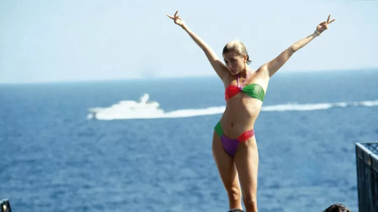 Στο στιγμιότυπο, η Μarie Chantal Miller, η τότε μέλλουσα σύζυγος του Παύλου με τολμηρό μπικίνι υιοθετεί μια εκκεντρική πόζα πάνω από την αδελφή της Pia, η οποία έναν χρόνο αργότερα θα παντρευόταν τον Christopher Getty. Οι δύο αδελφές με την παρέα τους πόζαραν με στυλ στην πισίνα του ξενοδοχείου Belair, στο Cap Ferrat, τον Ιούλιο του 1991.