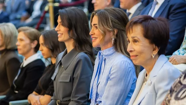 Στις φωτογραφίες που ανέβασε η βασίλισσα Ράνια της Ιορδανίας βλέπουμε και ένα στιγμιότυπο με την πριγκίπισσα Rajwa, τη σύζυγο του γιου της και διαδόχου το θρόνου, πρίγκιπα Hussein. Η πριγκίπισσα επέλεξε ένα φόρεμα σε αυστηρό ύφος από τη μάρκα Self Portrait σε γκρι τόνο. Ένα σύνολο που δεν μπορεί να συγκριθεί με τη φωτεινή γαλάζια και φινετσάτη εμφάνιση της βασίλισσας.