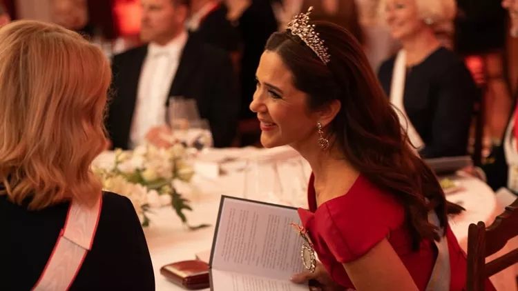 Για την περίσταση, η Mary επέλεξε ένα εντυπωσιακό κόκκινο σατέν φόρεμα του Δανού σχεδιαστή Soeren Le Schmidt, με ντεκολτέ σε σχήμα καρδιάς και πλισέ φούστα σε Α' γραμμή, το οποίο είχε φορέσει και σε βραδινό gala του 2018. Η σύζυγος του Frederik, η οποία το φόρεμα με την Antique Edwardian Tiara, που περιέχει διαμάντια και ρουμπίνια στη βάση και τον σκελετό. Η Antique Edwardian Tiara που φόρεσε η βασίλισσα Μαίρη της Δανίας (Mary of Denmark) είναι ένα από τα πιο ιδιαίτερα κοσμήματα της προσωπικής της συλλογής, όχι μόνο για την ομορφιά του αλλά και για την προέλευσή του.
