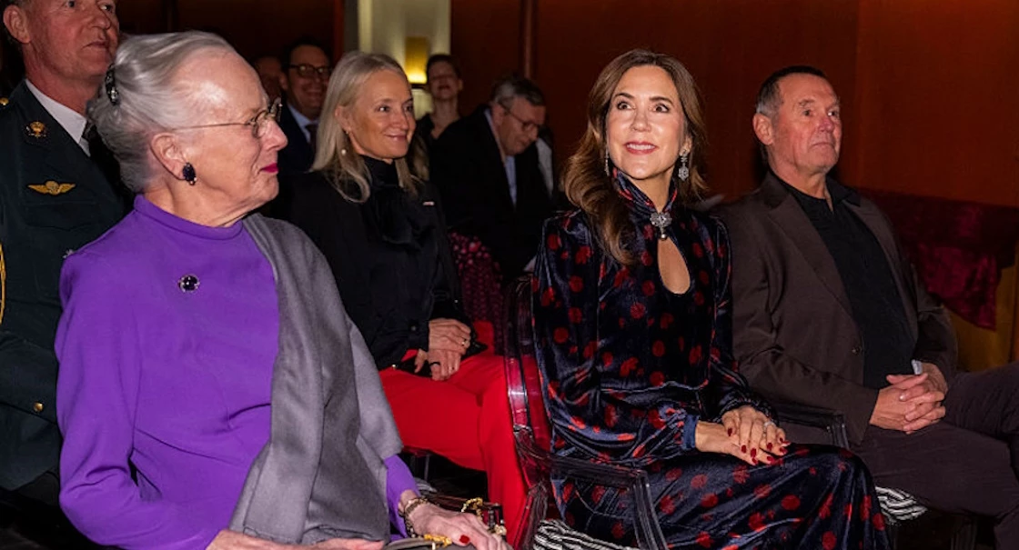 Η Mary της Δανίας τράβηξε την προσοχή όλων με midi φόρεμα με μανίκια τριών τετάρτων και γιακά στολισμένο με χρυσά και λευκά μοτίβα που πρόσθεταν μια ιδιαίτερα εκλεπτυσμένη πινελιά.