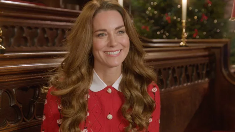 Φορώντας ένα γιορτινό πουλόβερ με κυρίαρχο χρώμα το κόκκινο, συνδυασμένο με λευκές λεπτομέρειες, η δούκισσα του Cambridge εμφανίζεται ευδιάθετη, ανακοινώνοντας την προβολή της χριστουγεννιάτικης συναυλίας στη βρετανική τηλεόραση, η οποία πραγματοποιήθηκε για φιλανθρωπικό σκοπό, προς τιμήν όλων εκείνων που ξεπέρασαν τον εαυτό τους για να βοηθήσουν με την πανδημία του κορονοϊού.