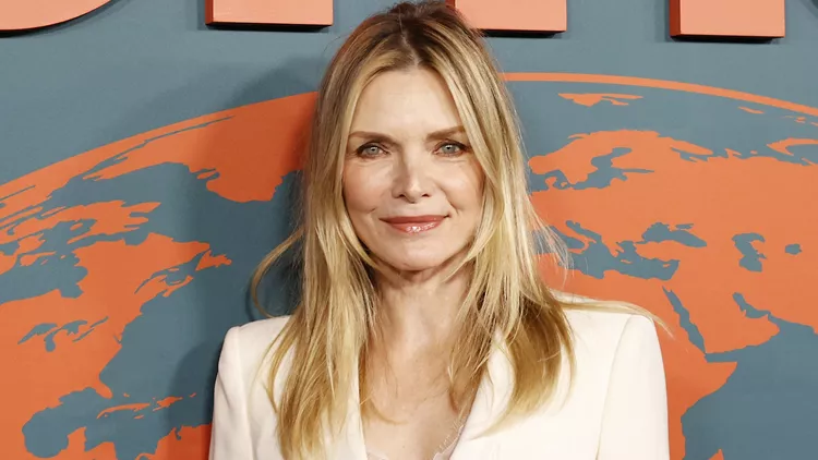 Στη φωτογραφία η Michelle Pfeiffer φοράει ένα μπεζ παλτό και ένα μαύρο τοπ ενώ τα ξανθά μαλλιά της πέφτουν απαλά στο πρόσωπό της και τονίζουν τα μπλε μάτια της.