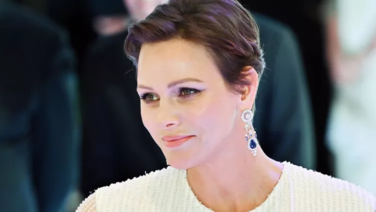 Η σύζυγος του πρίγκιπα Αλβέρτου του Μονακό επέλεξε ένα λευκό off shoulder φόρεμα με την υπογραφή του οίκου Louis Vuitton. Ολοκλήρωσε την εμφάνισή της με μία minaudiere τσάντα από τον ίδιο οίκο, μία χρυσή ζώνη και κίτρινα διαμαντένια σκουλαρίκια Graff.