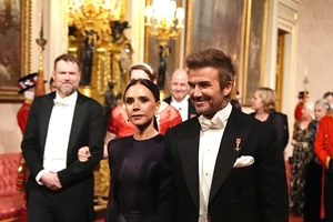 Για το επίσημο δείπνο, η βασίλισσα Καμίλα έδειχνε έτοιμη για τη γιορτινή περίοδο με ένα κόκκινο βελούδινο βραδινό φόρεμα Fiona Clare και τη διαμαντένια τιάρα Kokoshnik. Συμπλήρωσε την εμφάνισή της με μία φωτεινό μπλε βασιλική κορδέλα που κοσμούσαν εντυπωσιακές καρφίτσες κι ένα κολιέ που ανήκε στο παρελθόν στην αείμνηστη βασίλισσα Ελισάβετ.