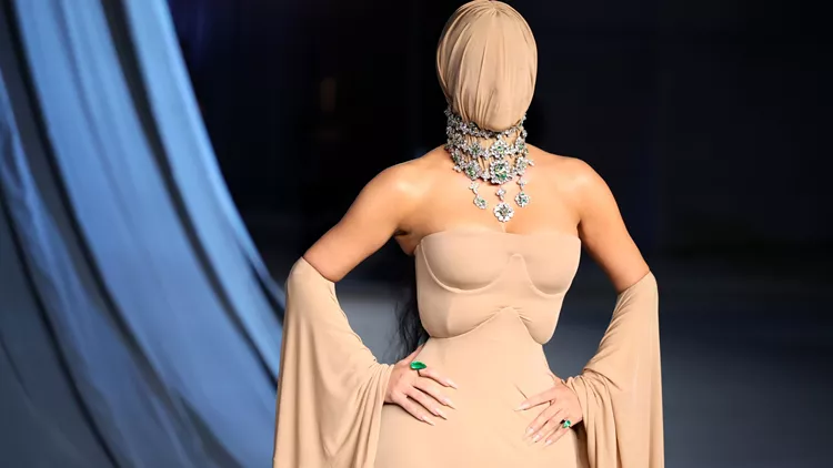 Η ιδρύτρια της SKIMS πόζαρε για τους φωτογράφους φορώντας μια full face μάσκα στο χρώμα του δέρματος, το ίδιο χρώμα που είχε και το φόρεμά της με στενό κορσέ στη μέση. Το look της είχε την υπογραφή Maison Margiela. Συγκεκριμένα, πρόκειται για δημιουργία από την πρώτη Artisanal συλλογή που παρουσίασε ο Glenn Martens για τον οίκο τον Ιούλιο. Το σύνολο ολοκλήρωνε ένα λαμπερό τσόκερ.