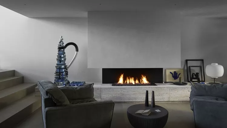 Σε όλο το σπίτι η Meyn έχει διαμορφώσει μια αρμονική ισορροπία μεταξύ μορφής και ελευθερίας. Οι χώροι είναι ανοιχτοί και φωτεινοί, με απρόσμενες γωνιές και ράφια που μοιάζουν να αιωρούνται στους τοίχους, δίνοντας σε κάθε κομμάτι τέχνης και διακόσμησης τη δυνατότητα να αναδειχτεί. Γλυπτά από τους Lars Zech και Jeanne Opgenhaffen, ένα δερμάτινο χαλί Pachamama και μπρούντζινα κομμάτια από τον Armando δημιουργούν συνθέσεις με έναν ρυθμό που τα αφήνει να ξεχωρίζουν αυτόνομα, ενώ παράλληλα ενισχύουν τη συνολική αρμονία του σπιτιού. Αυτά τα αντικείμενα, το καθένα με τη δική του ιστορία, αποτυπώνουν τη φιλοσοφία του Studio Piet Boon ότι ένα σπίτι δεν είναι ποτέ πλήρες χωρίς στοιχεία που αντικατοπτρίζουν την ψυχή των ενοίκων του.