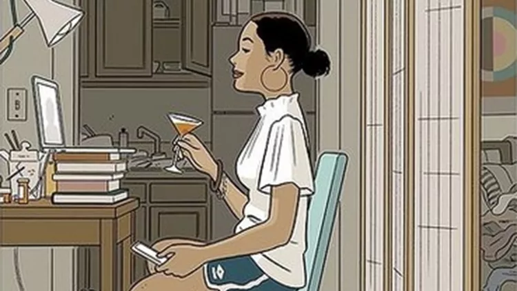 Στο εν λόγω έργο, o Tomine σκιαγραφεί με απόλυτη ακρίβεια την καθημερινότητα ενός ανθρώπου κατά τη διάρκεια του lockdown. Σ' ένα ακατάστατο δωμάτιο - γραφείο, με φόντο την κουζίνα, βλέπουμε πεταμένα αντικείμενα στο πάτωμα που όλοι μας θα αναγνωρίσουμε την τρέχουσα περίοδο. Την ίδια στιγμή, μία γυναίκα πίνει ένα Martini μπροστά στον υπολογιστή της, κάνοντας λίγο πολύ ό,τι και οι περισσότεροι από εμάς: ένα διαδικτυακό ραντεβού, όπου είμαστε ντυμένοι καλά μόνο από πάνω.