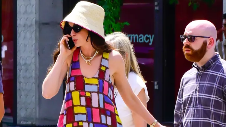 Σε μια εικόνα της Hathaway στα γυρίσματα, η 42χρονη φορούσε ένα κομψό μάξι φόρεμα με μοτίβο και ένα καπέλο, ενώ διέσχιζε έναν δρόμο της Νέας Υόρκης και μιλούσε στο τηλέφωνο.