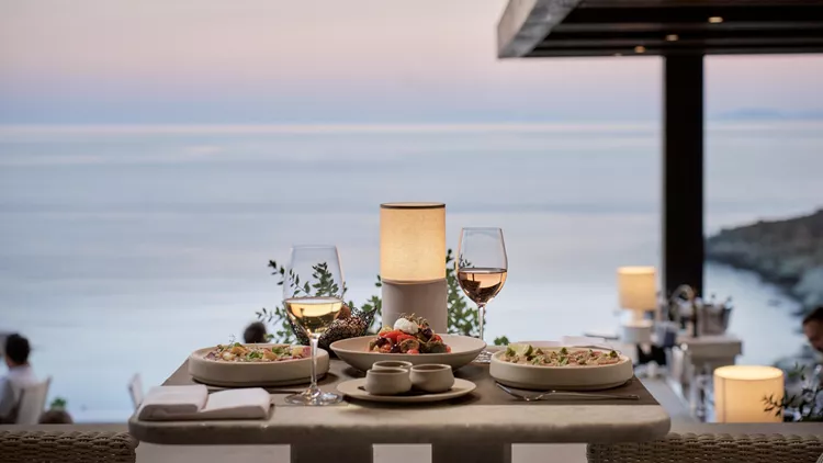 Με όνομα εμπνευσμένο από τη θεά της αυγής, το Eos Bar & Restaurant, μία κυκλαδίτικη brasserie, προσφέρει μία refined εμπειρία καθ’ όλη τη διάρκεια της ημέρας, από brunch έως δείπνο. Στο μενού, εντοπίζετε τηνιακές και μεσογειακές γεύσεις, οι οποίες παρουσιάζονται με μοντέρνα ματιά και τεχνική. Παράλληλα, ακριβώς δίπλα στη θάλασσα, το Nosti Beach Bar & Restaurant επαναπροσδιορίζει την έννοια της ταβέρνας. Με το όνομά του να παραπέμπει στη "νοστιμιά" και στον "νόστο", το Nosti προτείνει ένα μενού που επικεντρώνεται στην καθαρότητα των φρέσκων υλικών, από καλαμάρι σχάρας και φάβα μέχρι χταπόδι καρπάτσιο και γαρίδες σαγανάκι.