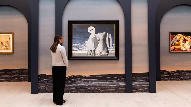 Το εικαστικό ταξίδι από την είσοδο της New Bond Street του οίκου Sotheby’s, όπου δύο επιβλητικά μάτια χυτευμένα σε επιχρυσωμένο μπρούντζο και γεμάτα "μαγκριτικά" θολά βλέμματα σας καλούν στον κόσμο της Pauline. Στο ισόγειο, το Παρίσι της δεκαετίας του 1920 ζωντανεύει: οι θεατές μεταφέρονται πίσω στη γέννηση του Σουρεαλισμού, καθώς περιηγούνται στον χώρο και πλησιάζουν βιτρίνες με ονόματα όπως L’Atelier des Rêves, με κινούμενες εικόνες να ξεπροβάλλουν από κάθε παράθυρο να κλείνουν το μάτι, να περπατούν και να χορεύουν σαν να έχουν ζωή. Παλιές γαλλικές λάμπες δρόμου ρίχνουν κύκλους φωτός σε παγκάκια όπου σύγχρονες εφημερίδες μοιάζουν να έχουν παγώσει στον χρόνο.