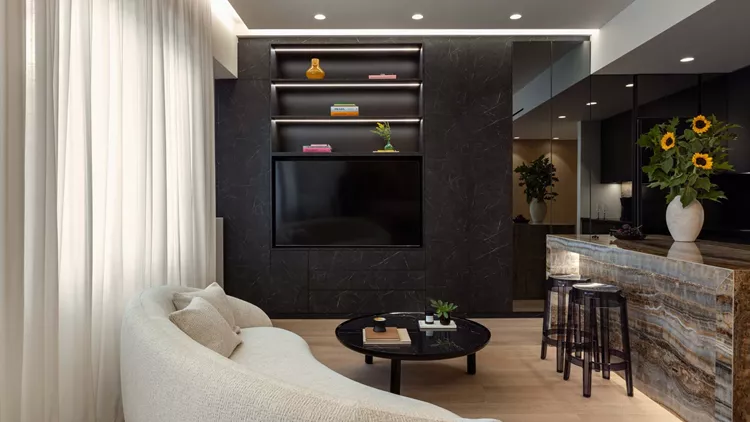 Η αισθητική εδώ δεν είναι θέμα τάσης, αλλά στάσης. Οι μαύρες ματ επιφάνειες λειτουργούν σαν φόντο που αναδεικνύει τη ζεστασιά του φυσικού ξύλου και τη δυναμική του όνυχα· οι φλέβες του θυμίζουν ζωγραφικό έργο σε διαρκή κίνηση. Ο θερμός, διακριτικός φωτισμός αγκαλιάζει τον χώρο και μεταμορφώνει τις αντιθέσεις σε αρμονία, μετατρέποντας το φως σε αρχιτεκτονικό εργαλείο.