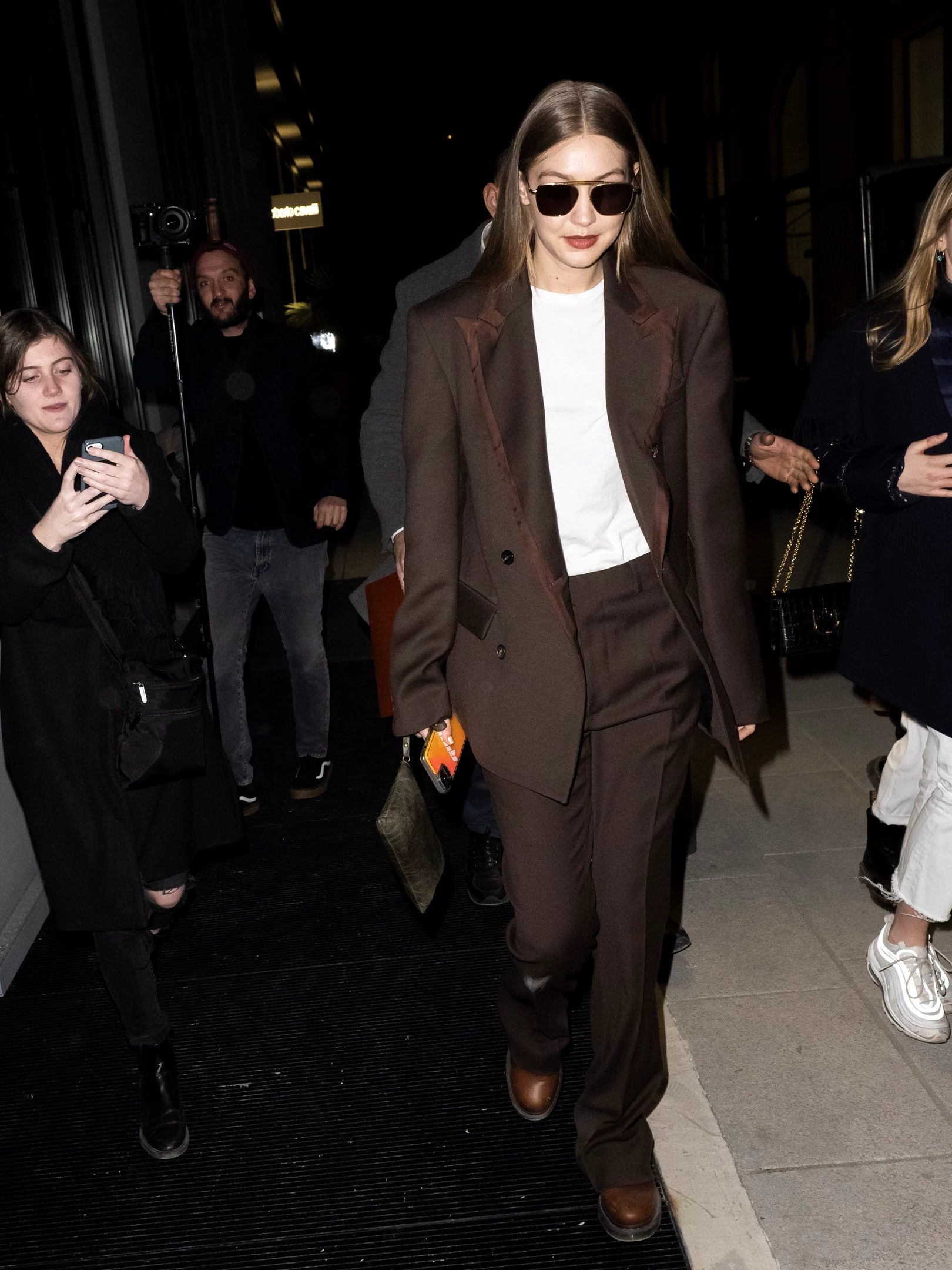 Με κοστούμι σε καφέ απόχρωση και το απόλυτο staple της γυναικείας γκαρνταρόμπας το λευκό τοπ, η μεγάλη από τις αδερφές Hadid δημιουργεί ένα minimal chic look.