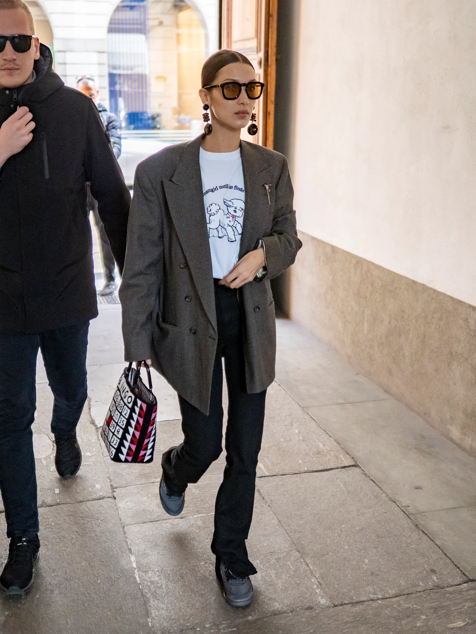 Me androgynous '90s inspired look η Bella καταφέρνει μια άψογη εμφάνιση στο Μιλάνο.