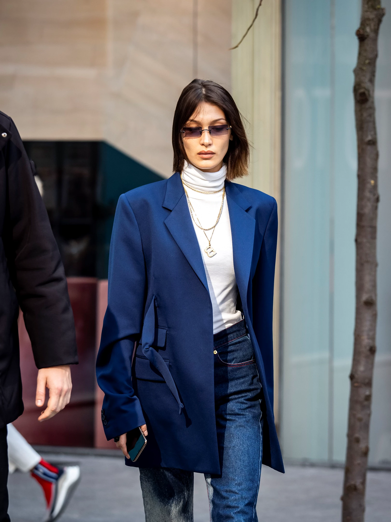 Η Bella με Vivienne Westwood oversized blazer σε μπλε απόχρωση.
