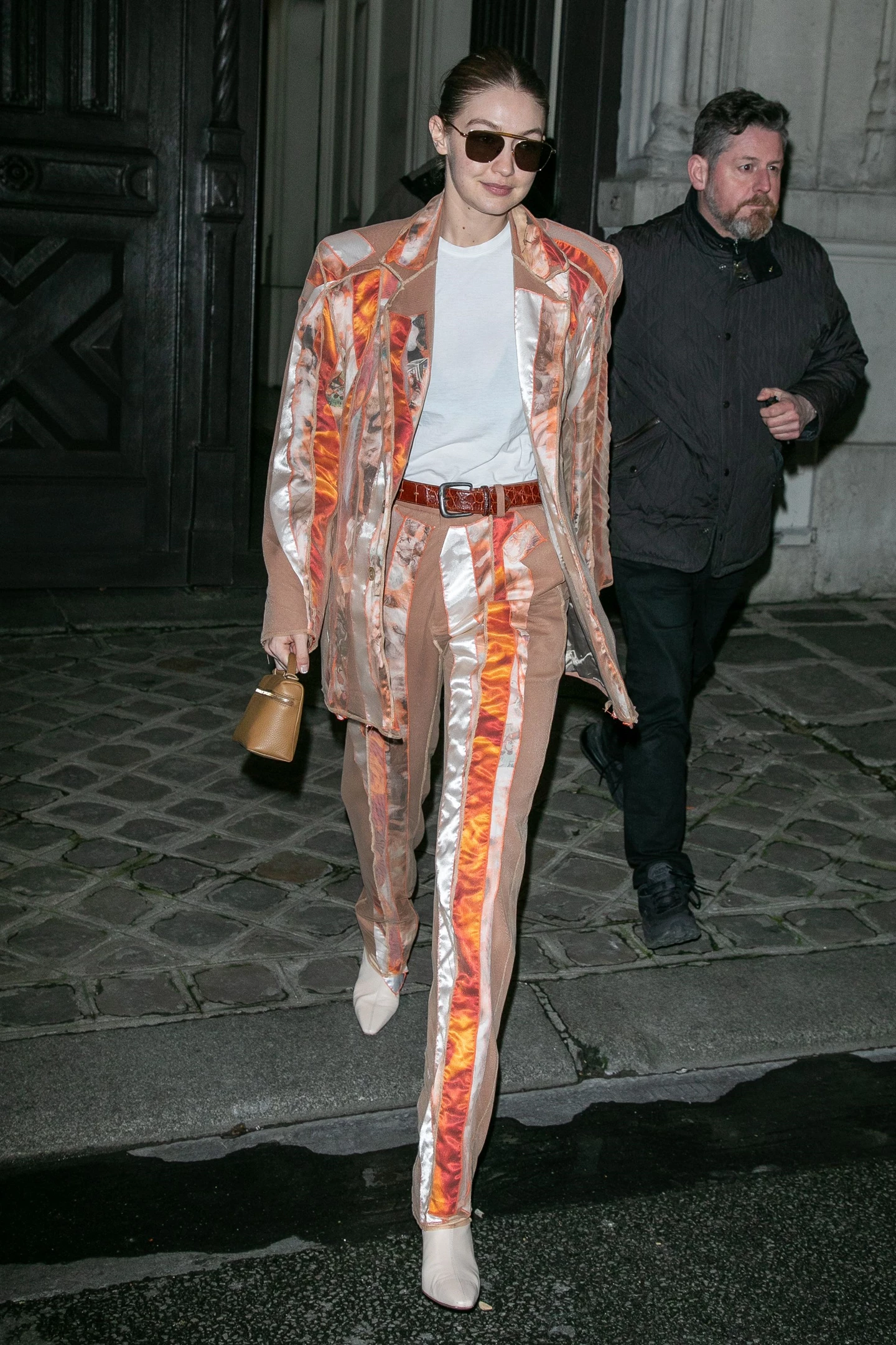 Με ριγέ κοστούμι σε γήινες και πορτοκαλί αποχρώσεις, η Gigi καταφέρνει μια statement εμφάνιση.