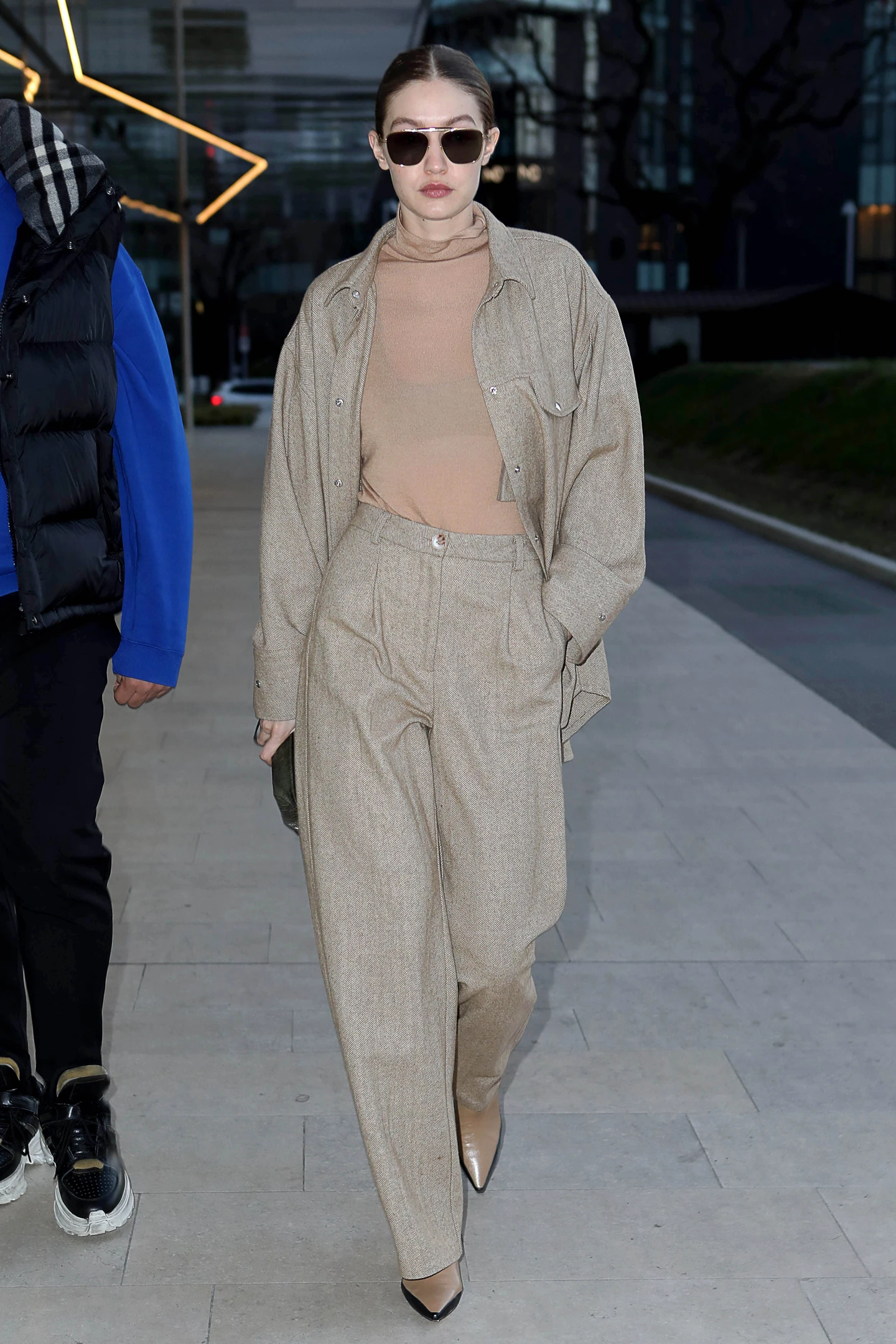 Ένα relaxed look με high-waisted παντελόνι σε γήινες, ουδέτερες αποχρώσεις, δίνει σ' αυτή την εμφάνιση της Gigi polished χαρακτήρα.