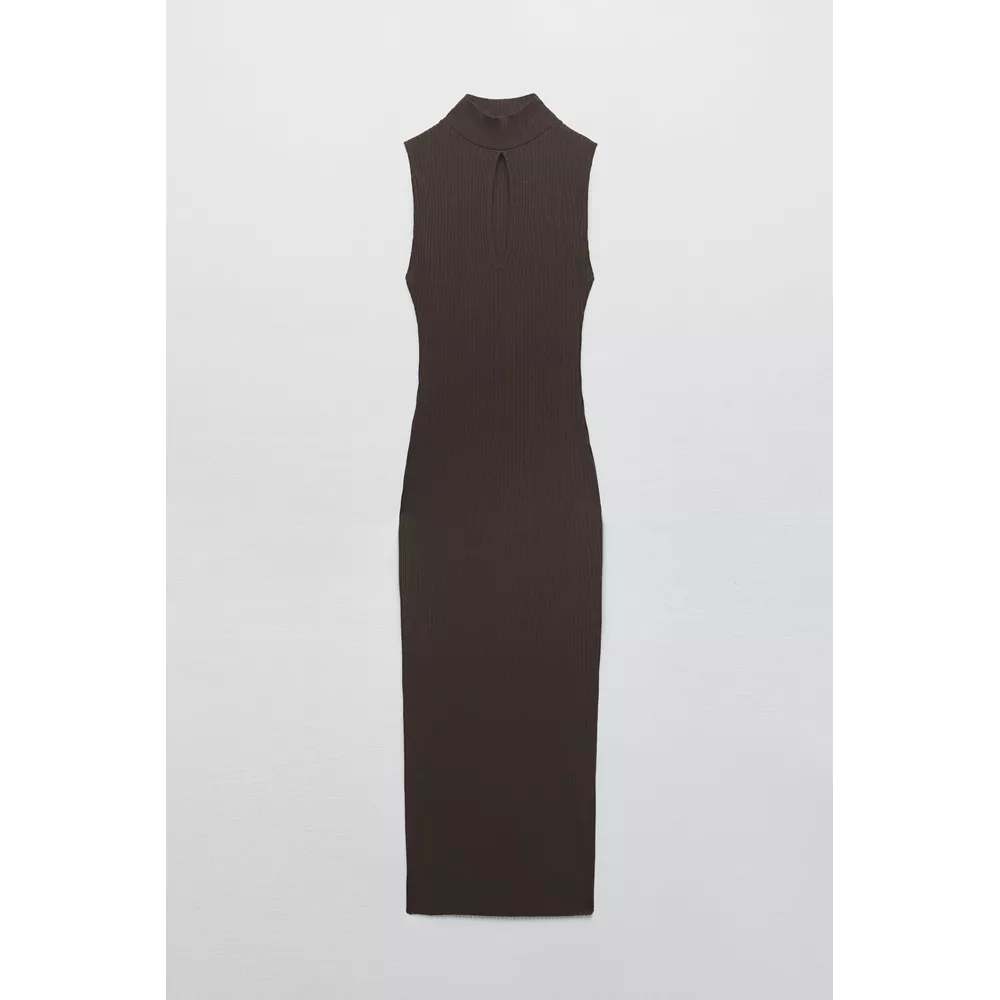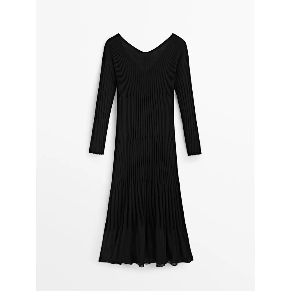 Μαύρο μακρύ φόρεμα ριμπ με λαιμόκοψη V, Massimo Dutti.