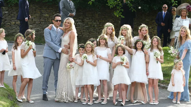 Το νυφικό της Kate Moss, δημιουργήθηκε από τον John Galliano με σαφείς αναφορές από τη δεκαετία του 20 και αποτέλεσε μετέπειτα πηγή έμπνευσης για τα bohemian bridal φορέματα πολλών διάσημων οίκων. Ημιδιάφανο slip dress με λεπτομέρειες από μεταξωτό ύφασμα, χρυσές πούλιες, κεντήματα, στρας και πέπλο ταίριαζε απόλυτα σε ένα αληθινό supermodel.