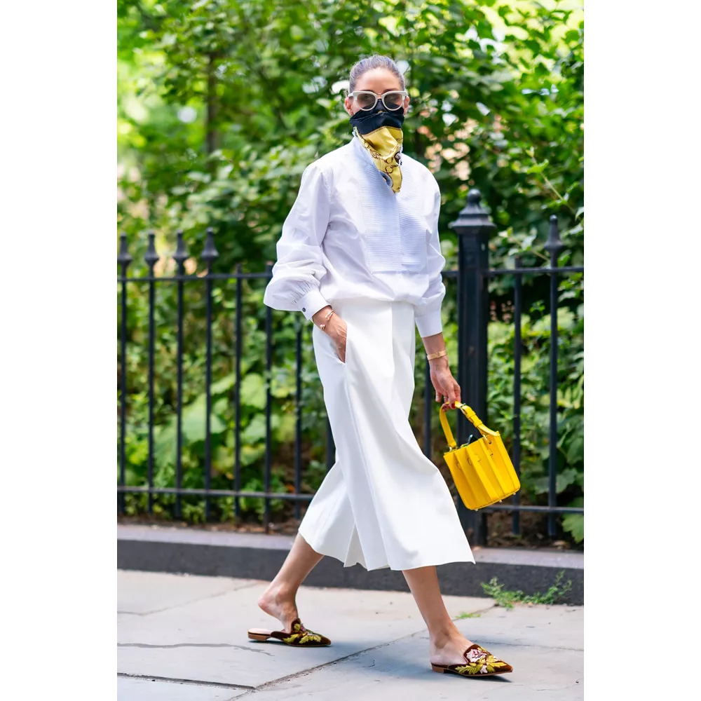Την ίδια στιγμή, μια διαφορετική εκδοχή για το πώς μπορούμε να προφυλάξουμε το πρόσωπό μας από τη μετάδοση του ιού άρχισε να κερδίζει έδαφος ως επιλογή. Το scarf – mask, ή αλλιώς το μαντήλι φορεμένο ως μάσκα, ήταν η πρόταση που πρώτη έκανε τάση η Olivia Palermo. Το γνωστό style icon σε όλες τις εμφανίσεις του επί πανδημίας έχει υιοθετήσει τον bandana-style τρόπο προστασίας, που με απλά λόγια σημαίνει: διπλώνει το (τετράγωνο) μαντήλι της διαγώνια και το δένει με τριγωνικό τρόπο στο πρόσωπό της. Το μυστικό της, βεβαίως, είναι ότι κάτω από το μαντήλι φοράει χειρουργική μάσκα προστασίας προσώπου, εξασφαλίζοντας με τον τρόπο αυτό και 100% ασφάλεια, και φυσικά στιλ.