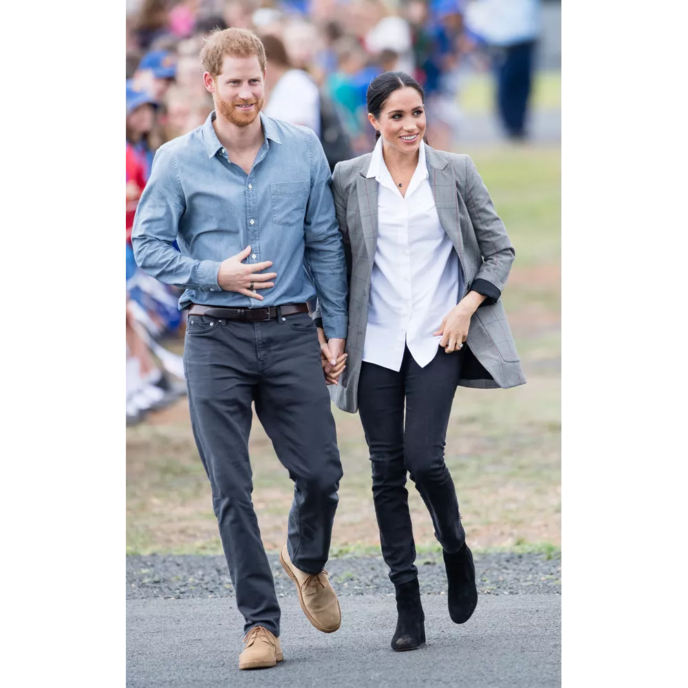 Στο πρώτο τους επίσημο ταξίδι ως ζευγάρι, τον Οκτώβριο του 2018 στη Νέα Ζηλανδία, η Meghan Markle επένδυσε αρκετά σε casual looks. Στο συγκεκριμένο, συνδύασε το μαύρο skinny jean της με λευκό πουκάμισο, γκρι καρό φαρδύ σακάκι και suede ankle boots.