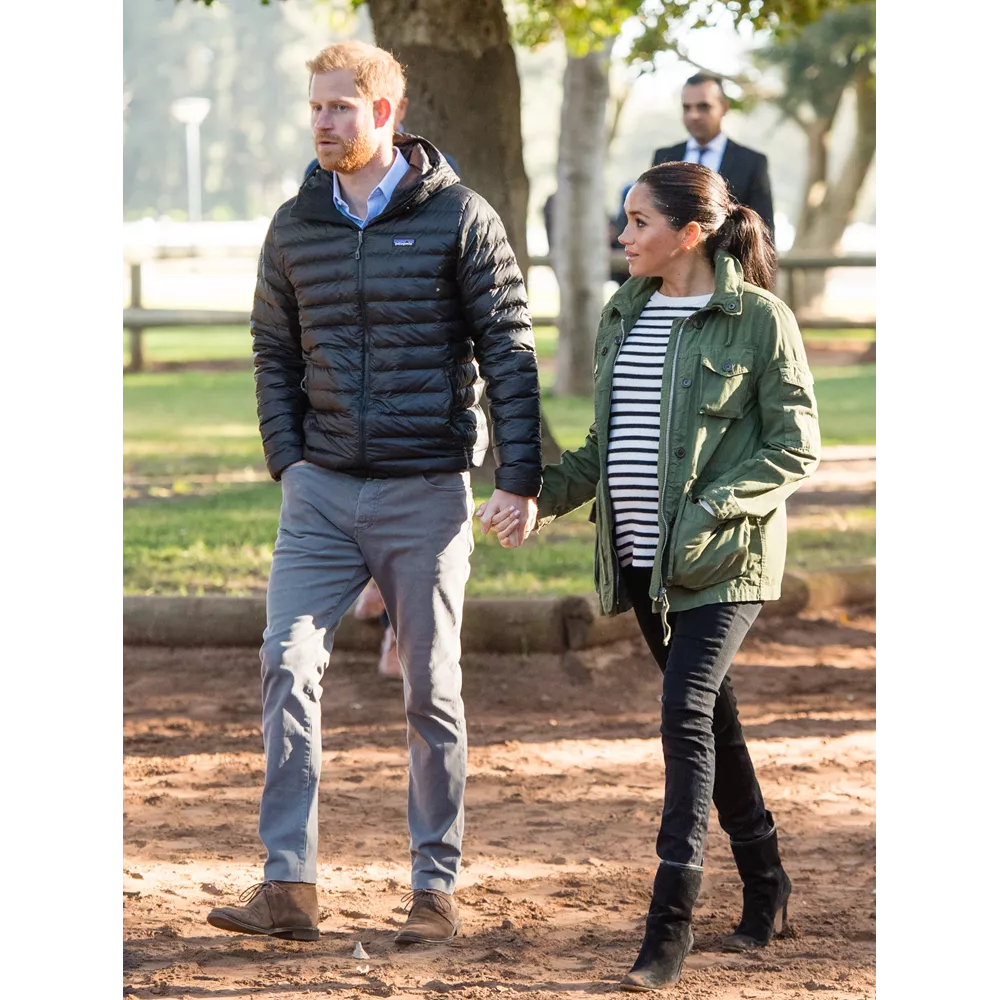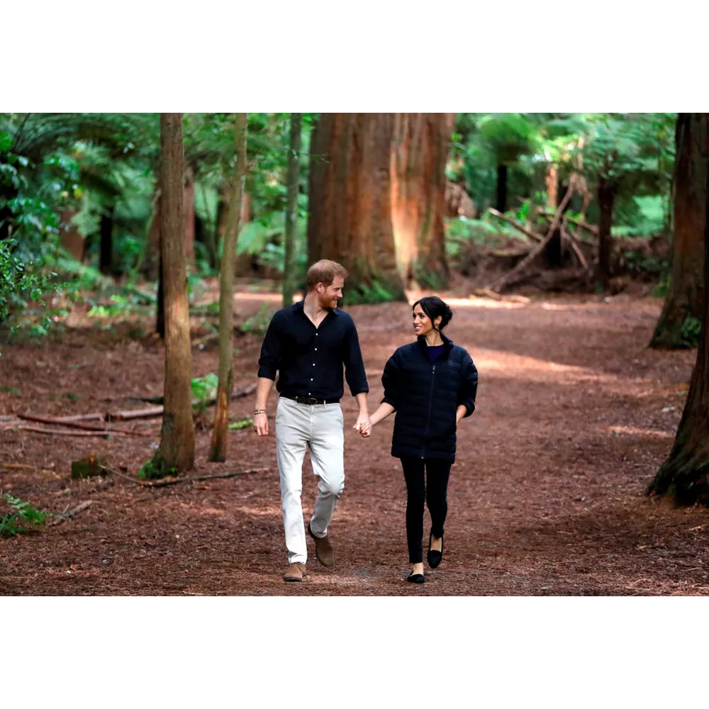 Λίγο πριν την αναχώρησή τους από τη Νέα Ζηλανδία, για τη βόλτα τους στο δάσος της Ροτόρουα, η Meghan φόρεσε το μαύρο της skinny jean με navy puffer μπουφάν και φλατ παπούτσια. Μάλιστα, το μπουφάν το δανείστηκε από τη γκαρνταρόμπα του Harry.