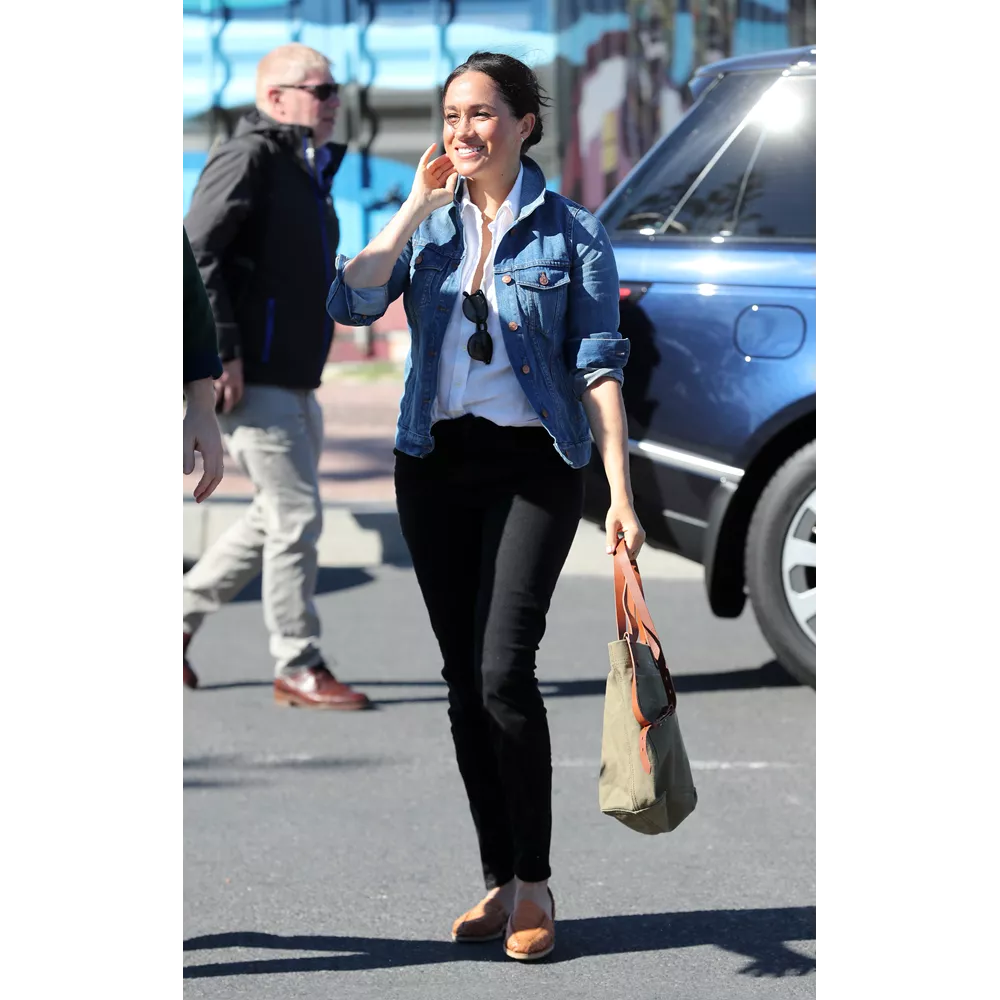 Μαθήματα στιλ παρέδωσε με τα outfits η δούκισσα του Sussex στο ταξίδι της στην Νότιο Αφρική τον Σεπτέμβριο του 2019. Σε μία από τις πιο casual στιγμές της, η δούκισσα συνδύασε το μαύρο της τζιν με λευκό λινό πουκάμισο, denim jacket και ένα ζευγάρι δερμάτινα φλατ. Bonus piece: η canvas tote bag της.