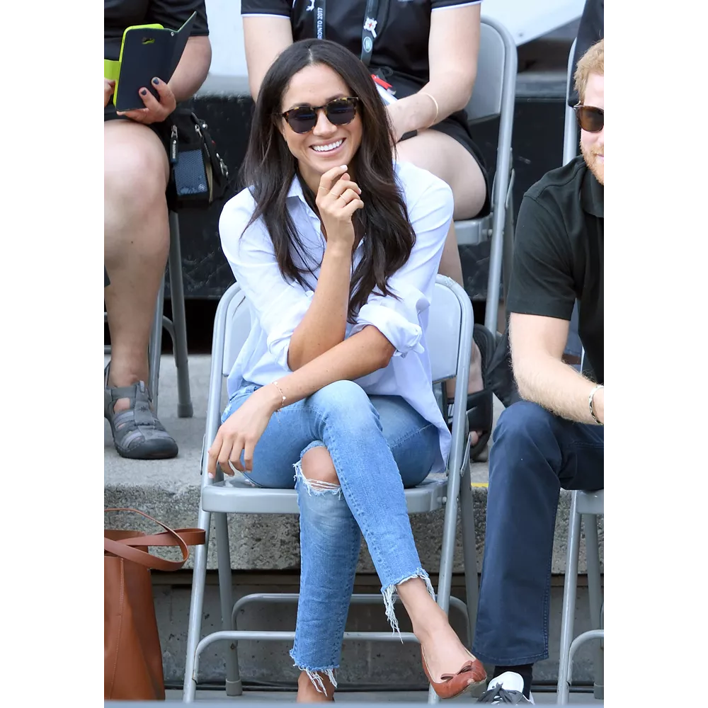 Λευκό πουκάμισο, τζιν παντελόνι με σκισίματα και ταμπά μπαλαρίνες, αυτά ήταν τα κομμάτια που υποστήριξαν το look της στην πρώτη επίσημη εμφάνιση της ως σύντροφος του Harry, το 2017 στο Τορόντο. Bonus piece: η oversized tote τσάντα.