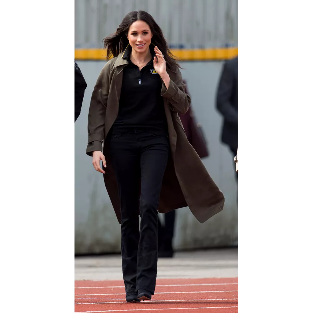 Τον Απρίλιο του 2018, λίγο πριν το γάμο της, η Meghan εμφανίζεται σε γήπεδο για να παρακολουθήσει τους φιλανθρωπικούς αγώνες Invictus Games φορώντας μπλούζα με το logo Invictus Games, μαύρο bootcut τζιν και χακί καμπαρντίνα.