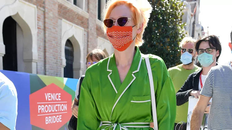 H βρετανίδα ηθοποιός έφτασε στο ξενοδοχείο της από μία βόλτα στο Λίντο της Βενετίας φορώντας ένα φωτεινό pajamas σύνολο του γάλλου σχεδιαστή Haider Ackermann, που αποτελείται από σατέν πουκάμισο σε έντονο πράσινο χρώμα, με ζώνη στη μέση, και σατέν loose παντελόνι σε έντονη μπλε απόχρωση . Το look της ολοκλήρωσε μ' ένα ζευγάρι βελούδινα slippers σε χρώμα στην ίδια απόχρωση με το παντελόνι της, μοντέρνα cat-eye γυαλιά ηλίου Cartier, ενώ κρατούσε μια λευκή Loewe ballon bag. Το τέλειο color blocking στην εμφάνισή της ολοκλήρωσε με μια μάσκα προστασίας σε πορτοκαλί χρώμα.