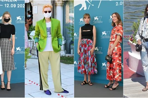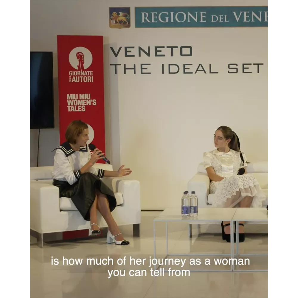 Στη συζήτηση που διοργάνωσε ο οίκος Miu Miu στη Βενετία για την προώθηση του Miu Miu Women's Tales μ' ένα σύνολο από ναυτικό πουκάμισο, δερμάτινη pencil φούστα και λευκές γόβες Miu Miu.