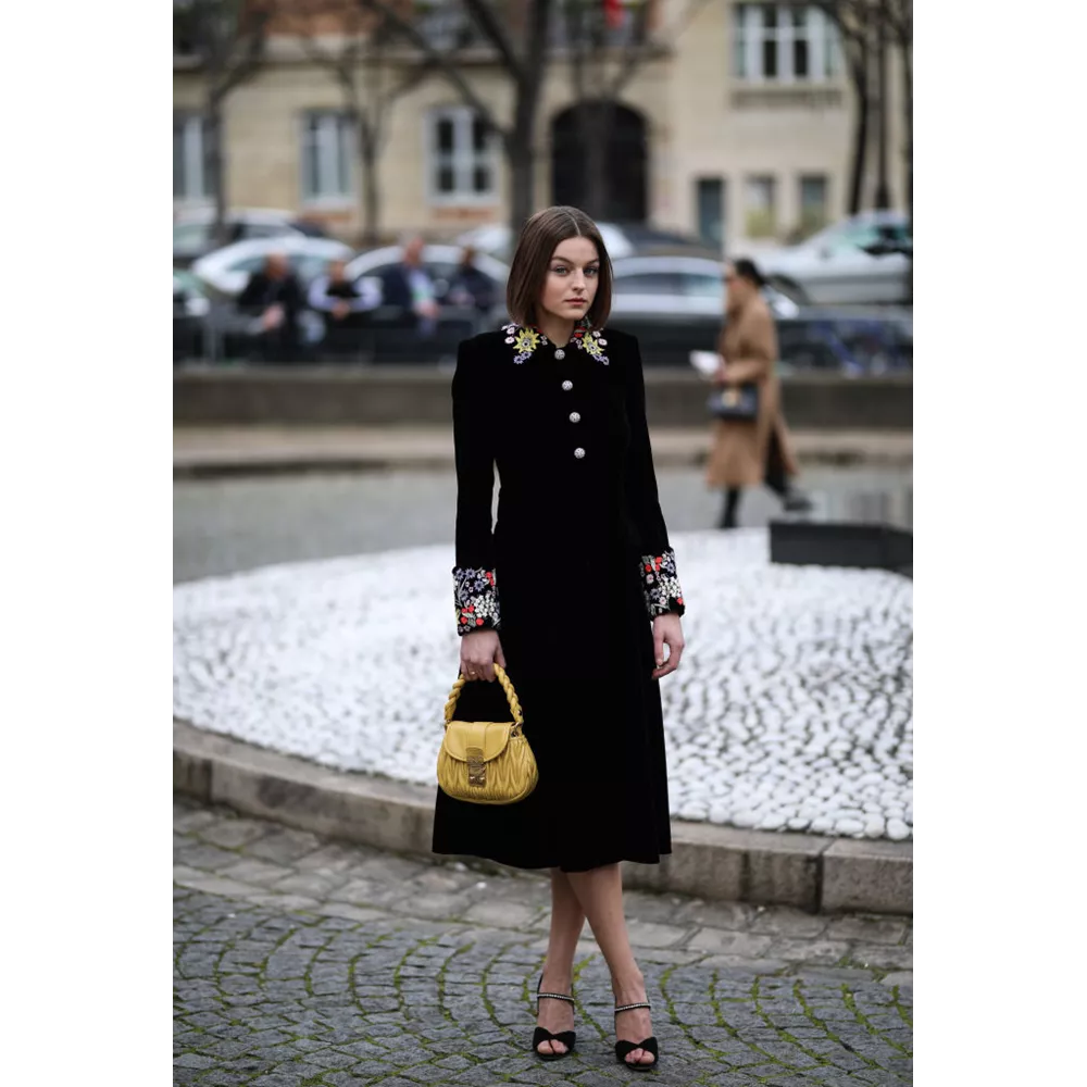 Στο Παρίσι για το fashion show της συλλογής Fall/Winter 2020/2021 του Miu Miu με φόρεμα με κεντημένο γιακά και μανίκια, τσάντα και πέδιλα επίσης Miu Miu.