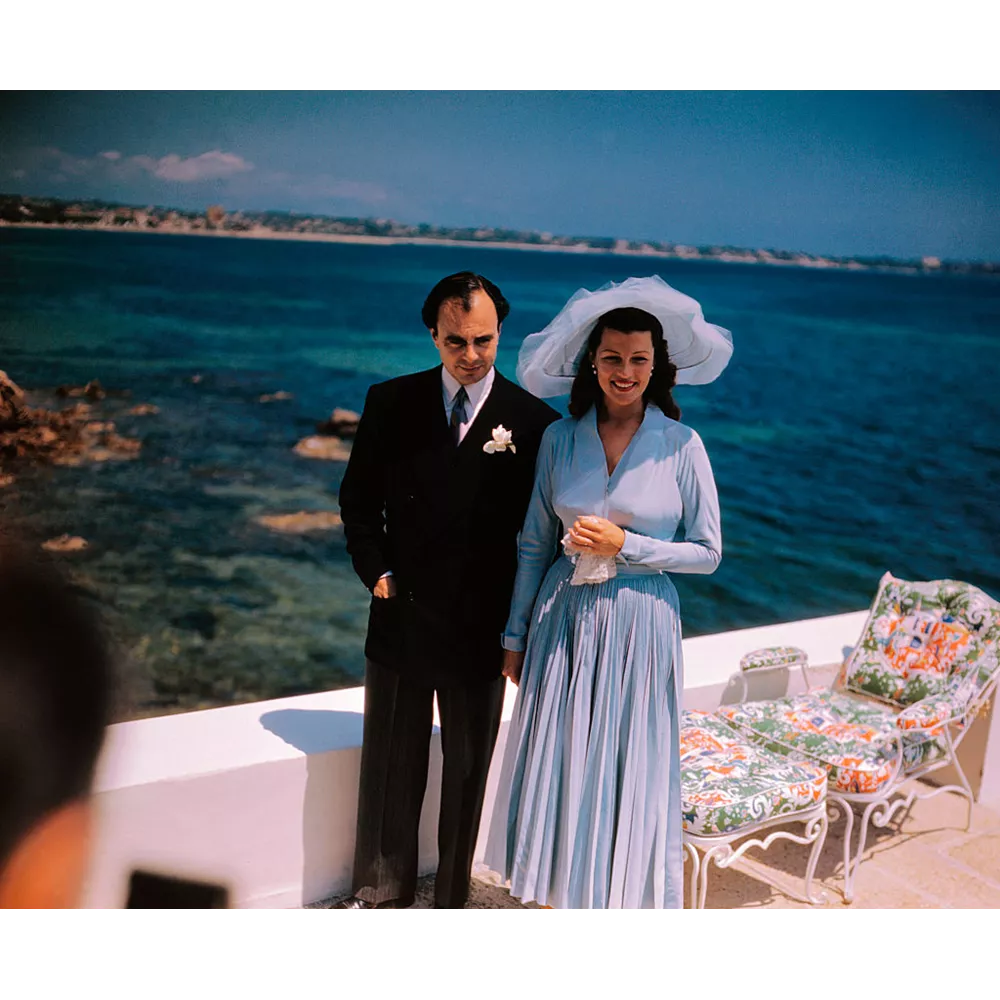 Η Rita Hayworth με γαλάζιο φόρεμα στον γάμο της με τον Πρίγκιπα Aly Khan το 1949.