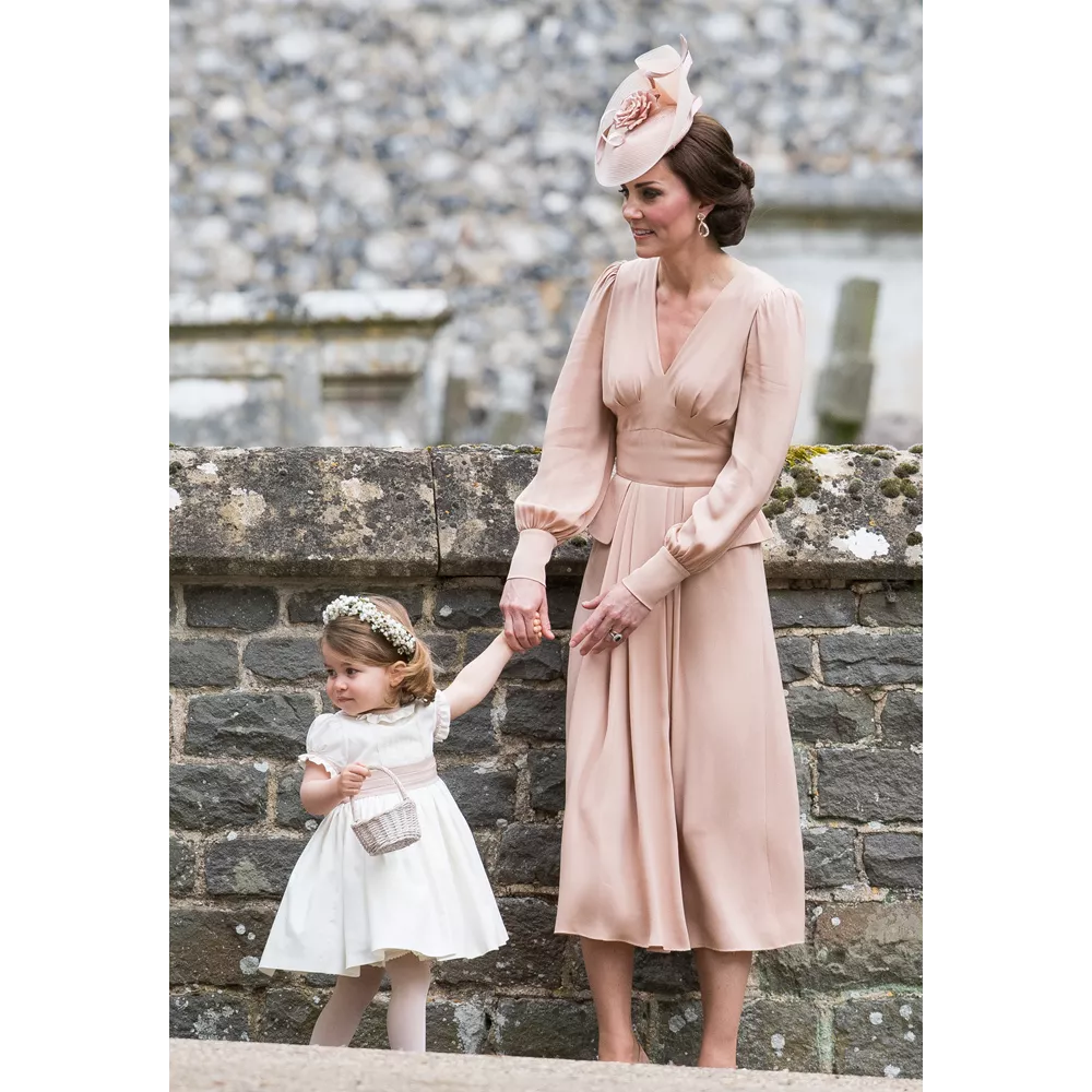 Στον γάμο της αδεφλής της, Pippa Middleton, το 2017, μ' ένα dusty pink σιφόν πλισέ φόρεμα.