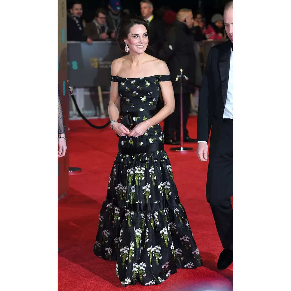 Στην εκδήλωση για τα βραβεία BAFTA τον Φεβρουάριο του 2017 μ' ένα off-shoulder φόρεμα με φλοράλ prints.
