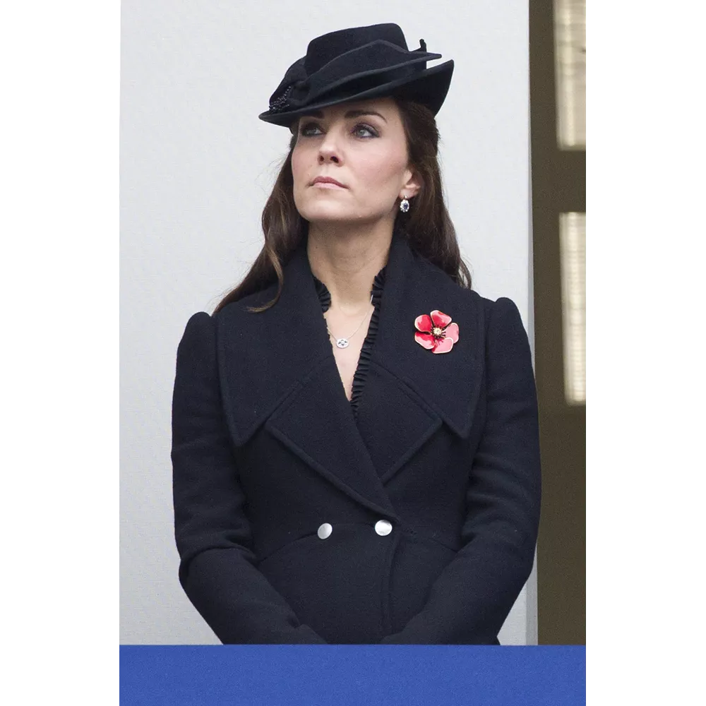 Η Kate Middleton στις εκδηλώσεις για το Remembrance Day του 2014 με μαύρο σταυροκουμπωτό παλτό Alexander McQueen με μεγάλο γιακά.