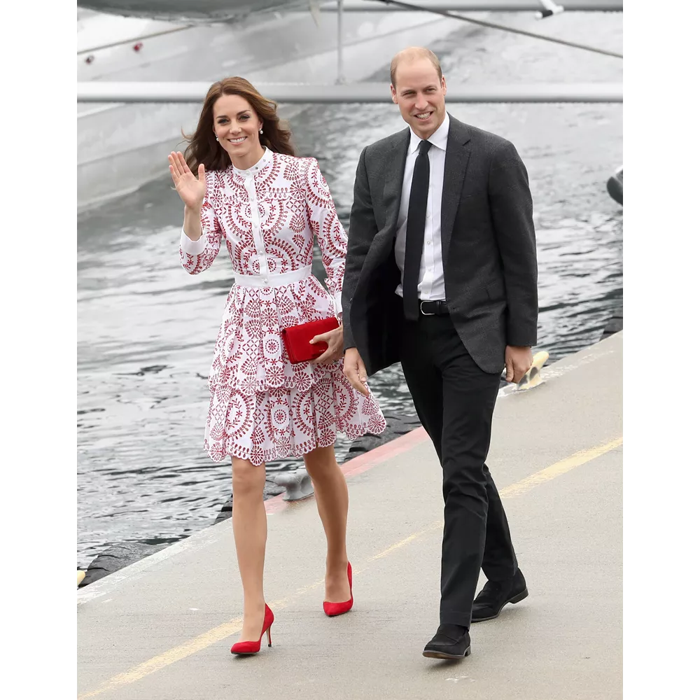 Στην περιοδεία της με τον William στον Καναδά, το 2016, μ' ένα φόρεμα σε άσπρο - κόκκινο.