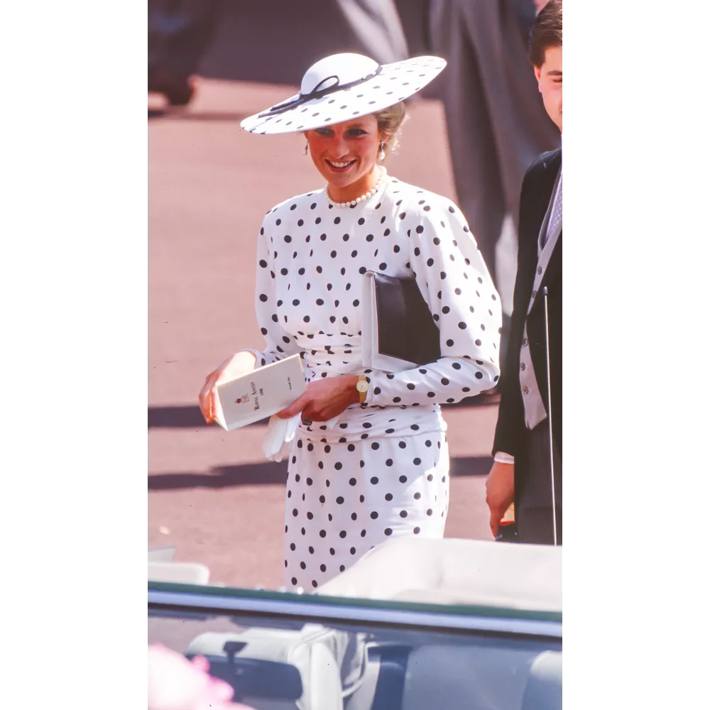 Μ' ένα πουά φόρεμα και ασορτί καπέλο στις ιπποδρομίες του Άσκοτ το 1988.
