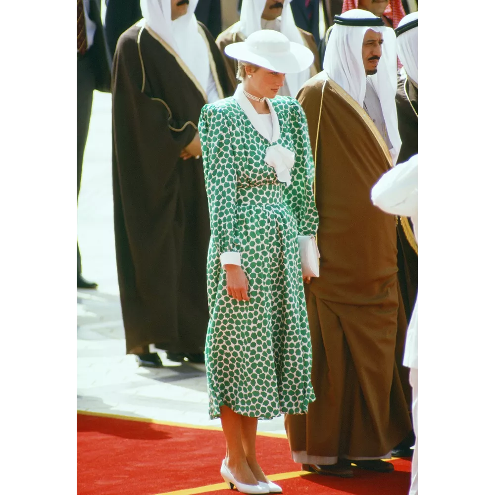 Μ' ένα εμπριμέ φόρεμα της Catherine Walker, λευκές γόβες και clutch κατά την άφιξή της στη Σαουδική Αραβία το 1986.