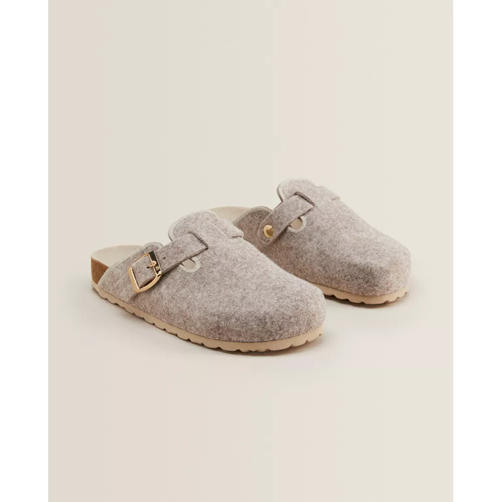 Παντόφλες σαμπό από τσόχα διακοσμημένες με χρυσαφί αγκράφα, Zara Home.