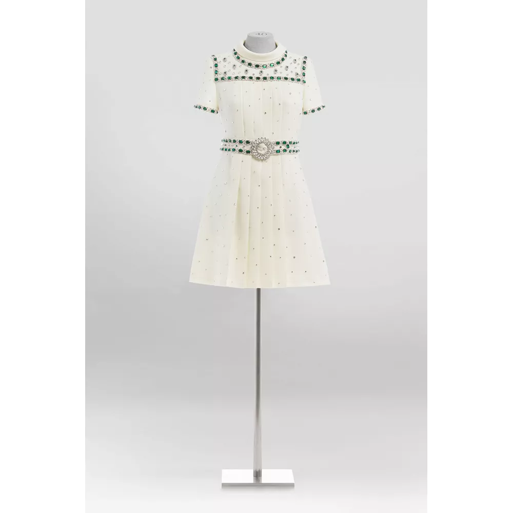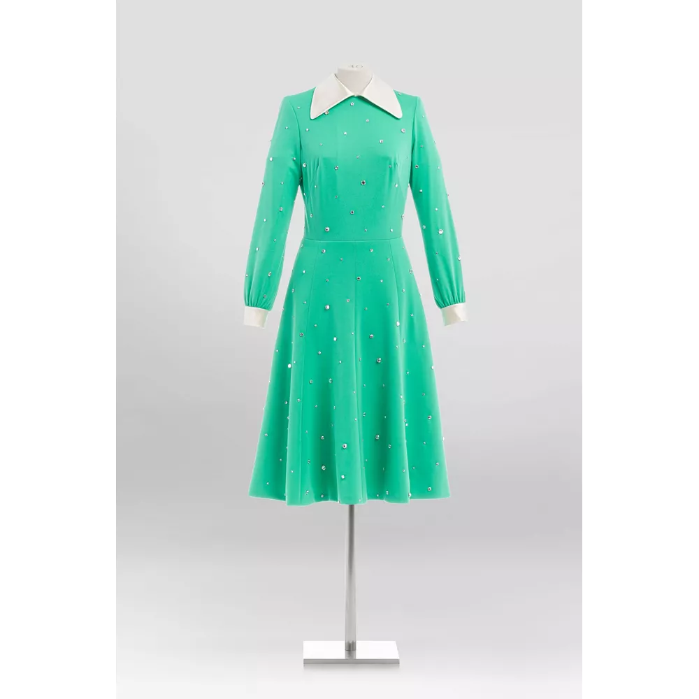 Φόρεμα από μεταξωτό κρεπ από τη δεκαετία του 1960 με πιέτες στο οποίο προστέθηκε κέντημα από πράσινα κρύσταλλα, διαθέσιμο στη μπουτίκ Miu Miu στη Σανγκάη.