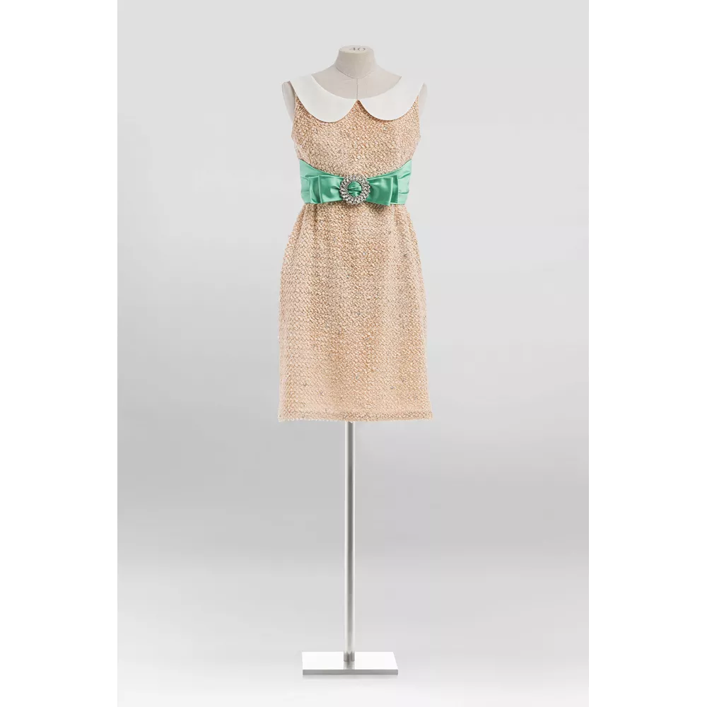 Εκρού φόρεμα από τη δεκαετία του 1960 στο οποίο προστέθηκε λευκός μεταξωτός γιακάς, πράσινη ζώνη και κεντήματα, διαθέσιμο στη μπουτίκ Miu Miu στη Νέα Υόρκη.