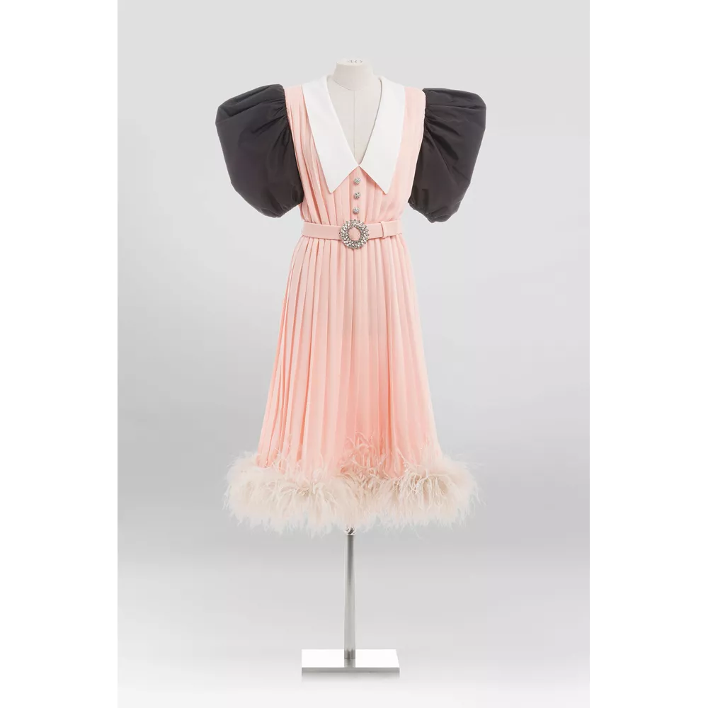 Ροζ πλισέ φόρεμα από τη δεκαετία του 1970 στο οποίο προστέθηκαν μαύρα κεντημένα μανίκια, ζώνη με κρύσταλα στην αγκράφα και λεπτομέρεια με φτερά στο τελείωμα, διαθέσιμο στη μπουτίκ Miu Miu στο Λονδίνο.