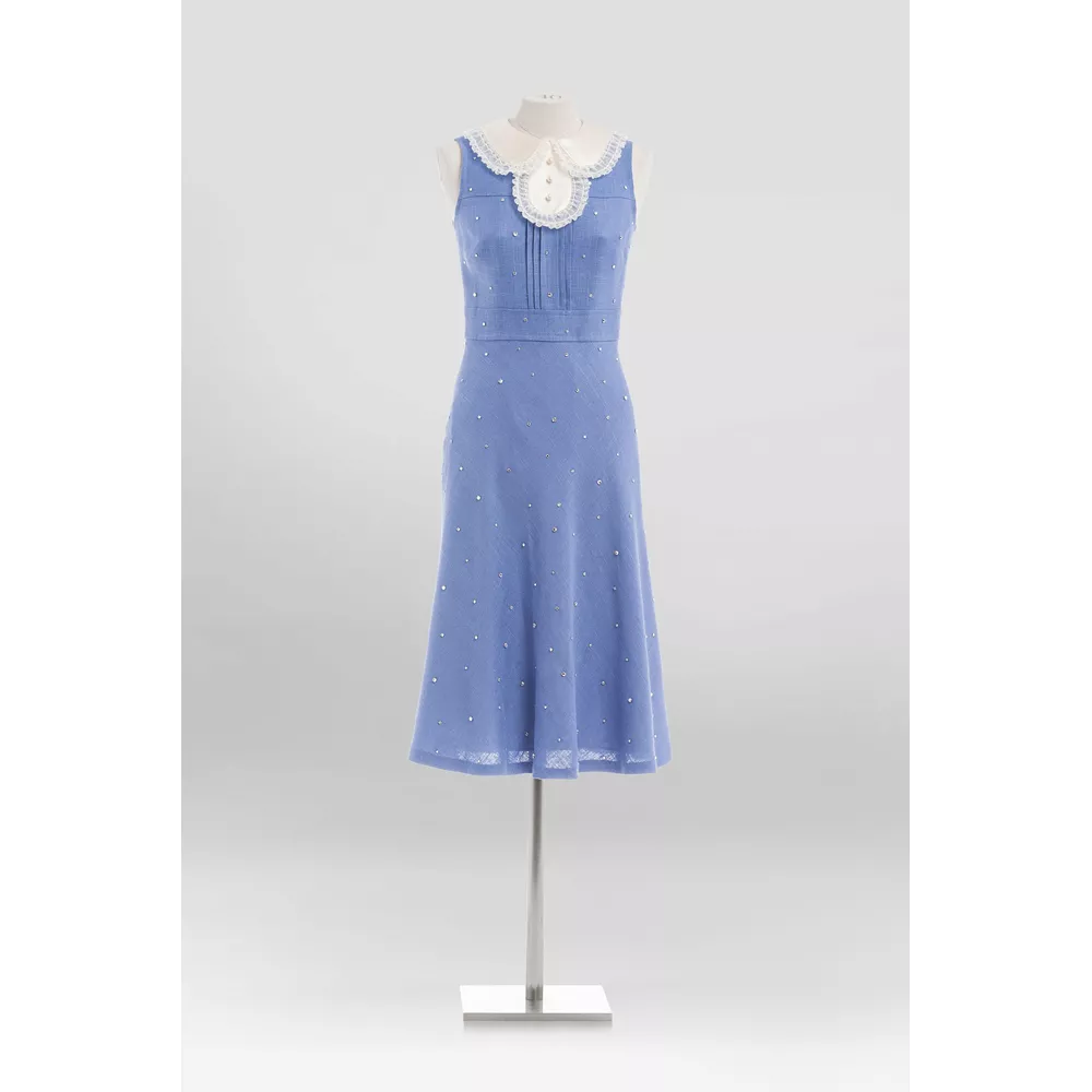 Λινό φόρεμα από τη δεκαετία του 1970 στο χρώμα της λεβάντας στο οποίο προστέθηκαν δαντελένιος γιακάς και φινίρισμα με κρύσταλλα, διαθέσιμο στη μπουτίκ Miu Miu στο Τόκιο.