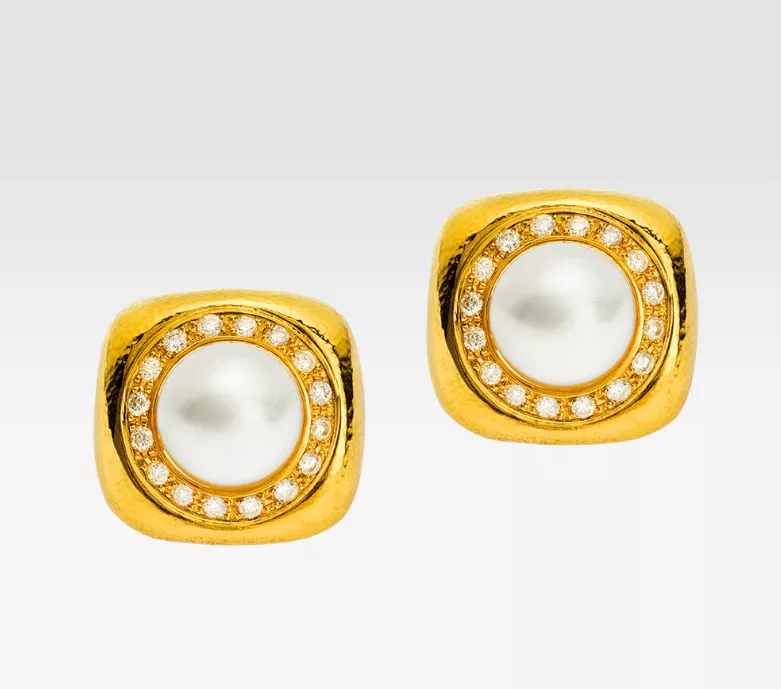Σκουλαρίκια σε σφυρήλατο κίτρινο χρυσό 22ΚΤ με μαργαριτάρι και διαμάντια, Zolotas